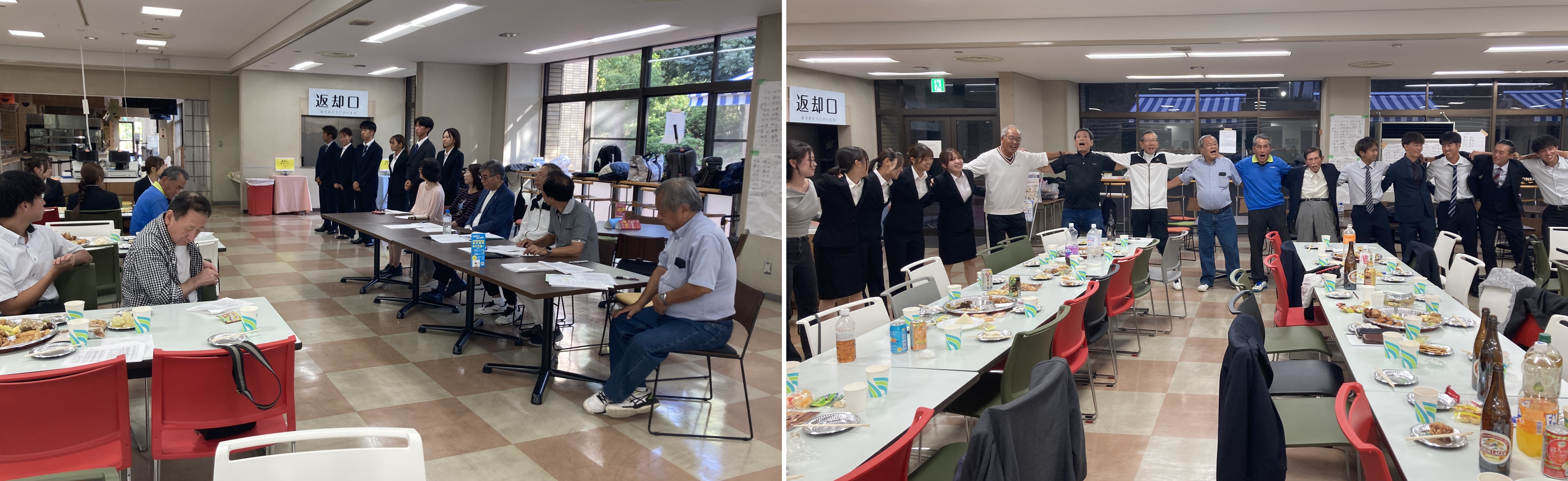 引き続き行われた懇親会では,各テーブルで食事をとりながら現役とOB・OGの交流が図られ,その合間に現役とOB・OG諸氏から自己紹介や近況報告が行われ,最後に全員が肩を組んで恒例となった学歌,応援歌を斉唱し,エールで締め括りました(終了時間は17時30分)。本当に楽しい一日になりました。