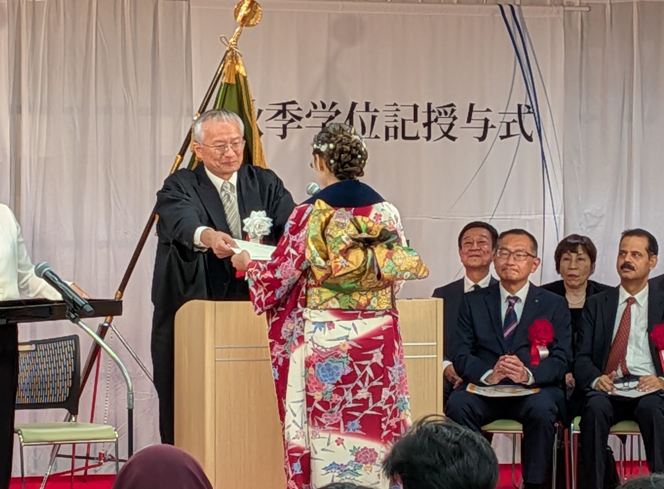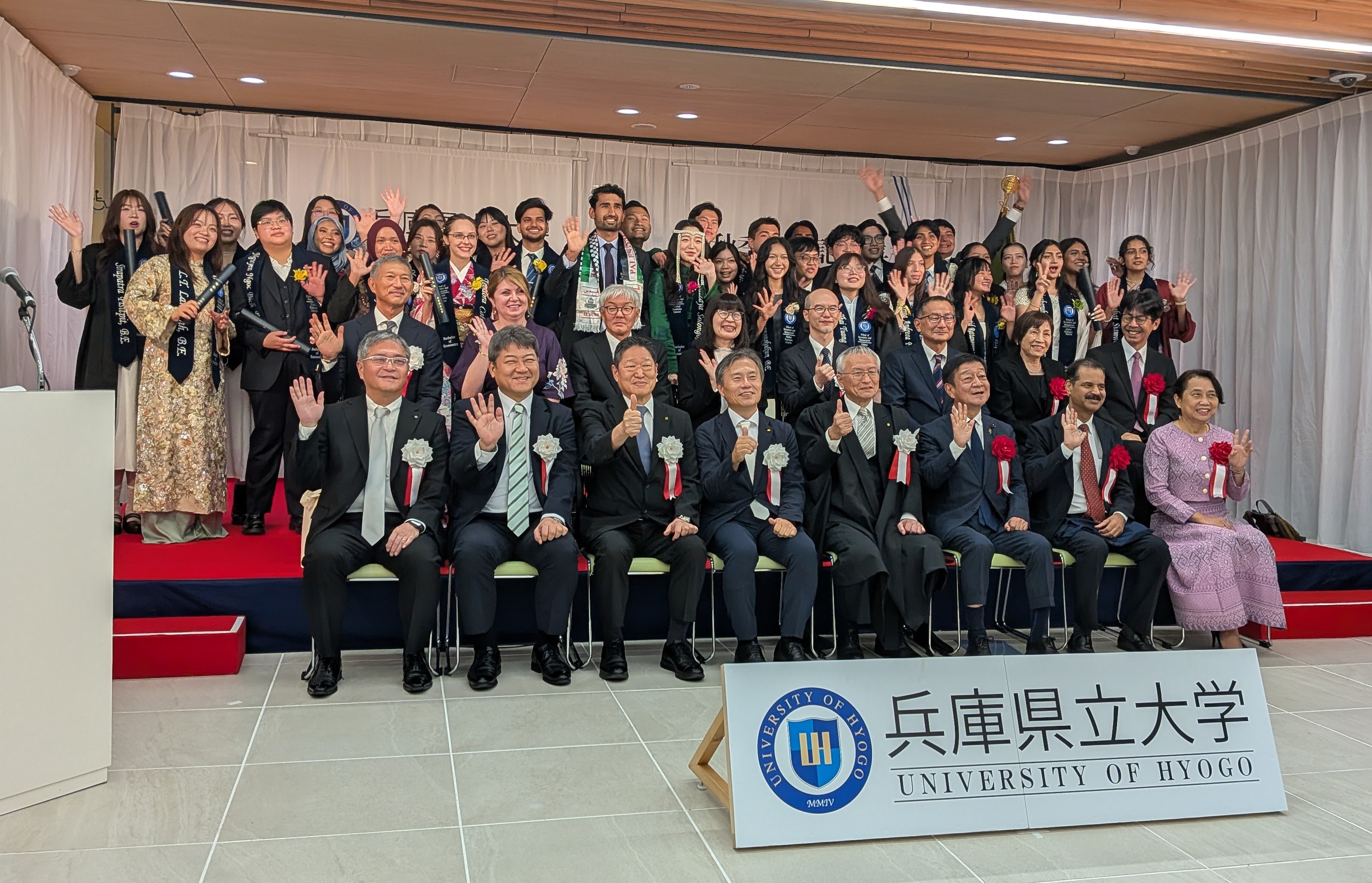 令和7年9月18日(木)14時から 神戸商科キャンパス i-Square において、 国際商経学部(グローバルビジネスコース及びグローバルビジネス専攻)の学位記授与式が執り行われました。タイやベトナム、インドネシアなど12カ国34名の方が卒業されました。淡水会からは、副会長の森田昌子氏(G25)が参列されました。